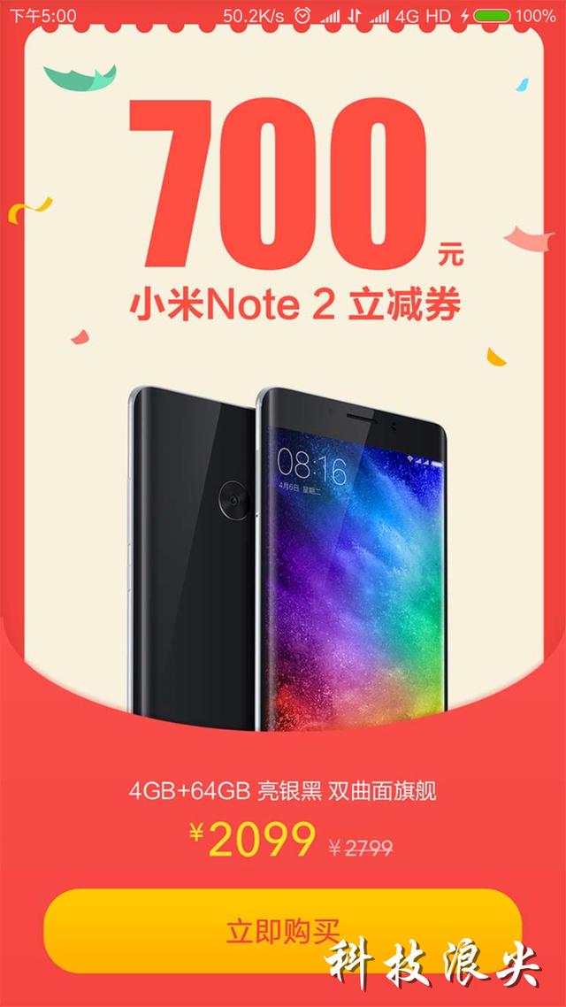 今天登录小米商城的时候跳出了这个700元立减券,我非常的吃惊,想不到小米Note 2的降价幅度这么大。Note 2也是目前小米在售手机中,唯一一款双曲面屏幕旗舰。